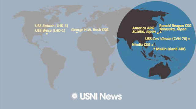 Theo bản tin từ trang USNI (U.S. Naval Institute - Học Viện Hải Quân Hoa Kỳ) thì tính đến ngày 17 tháng 4 năm 2023, Hải Quân Hoa Kỳ đã điều động một số lượng lớn Hàng Không Mẫu Hạm tấn công và tàu đổ bộ (carrier strike groups and amphibious):
