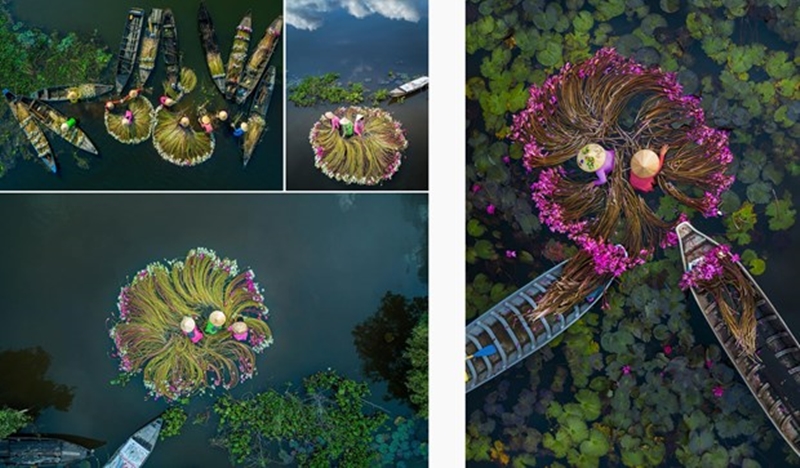 ảnh rửa hoa súng trên sông, trong đó bức ”Hoa trên nước” (góc dưới,